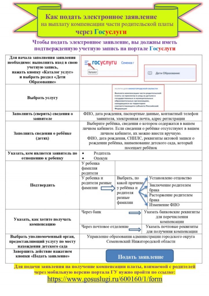 Подача электронного заявления на выплату компенсации части родительской платы через Госуслуги