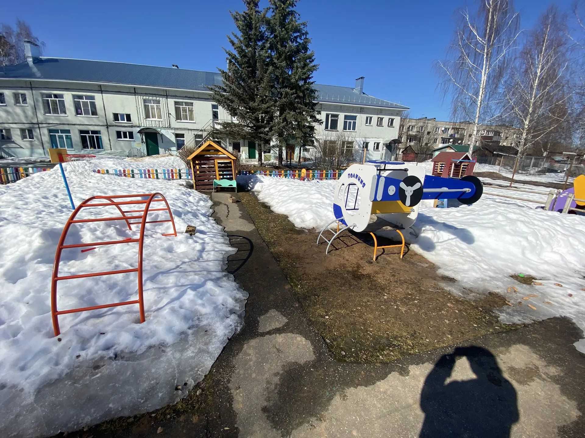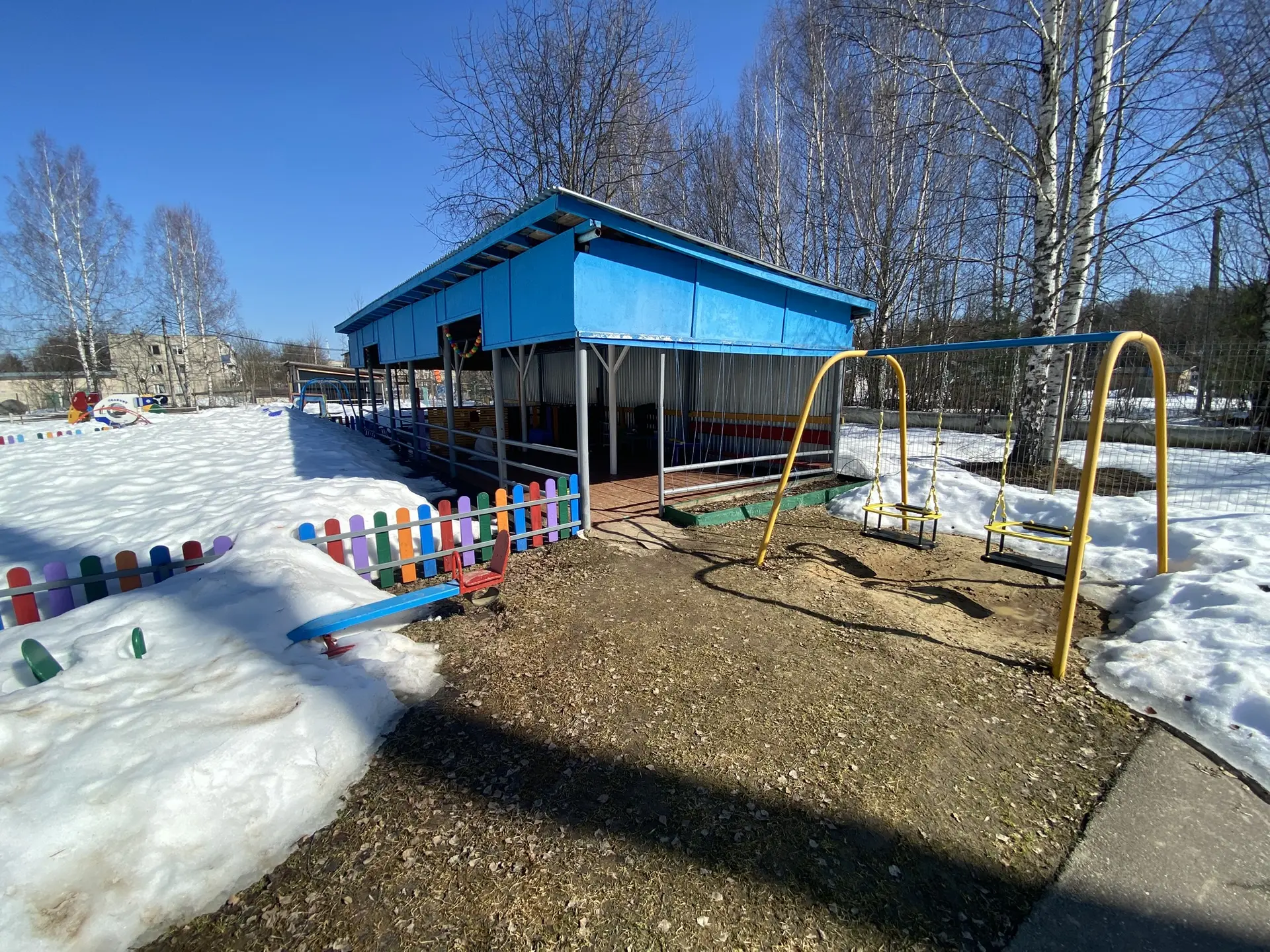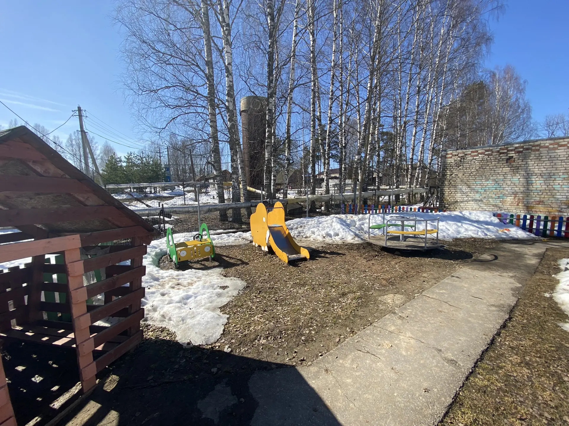 Для защиты детей от солнца и осадков на территории каждой прогулочной площадки установлены крытые веранды. Прогулочные площадки оборудованы малыми игровыми формами в соответствии с возрастом: песочницами, лесенками, горками, местами уединения (домиками), качелями, машинками и др.