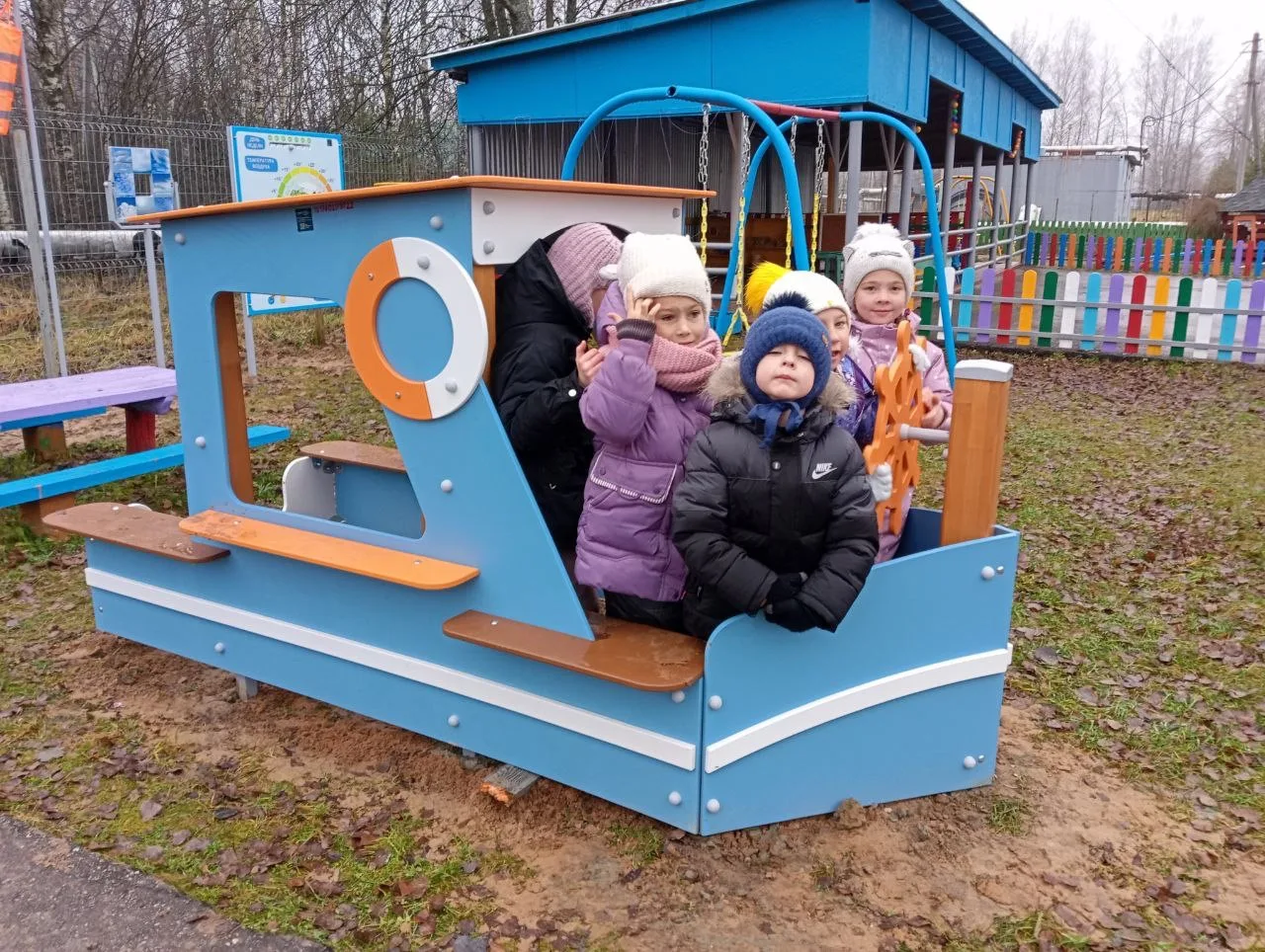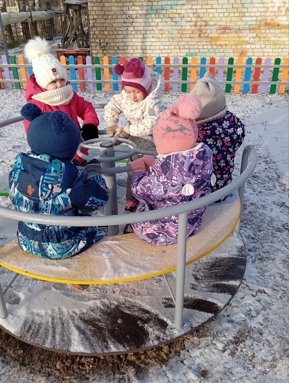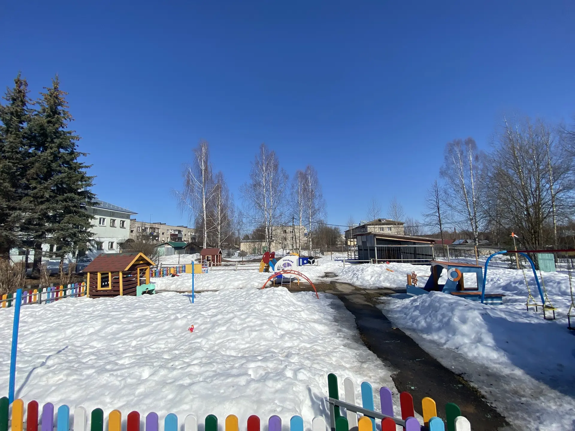 Для защиты детей от солнца и осадков на территории каждой прогулочной площадки установлены крытые веранды. Прогулочные площадки оборудованы малыми игровыми формами в соответствии с возрастом: песочницами, лесенками, горками, местами уединения (домиками), качелями, машинками и др.