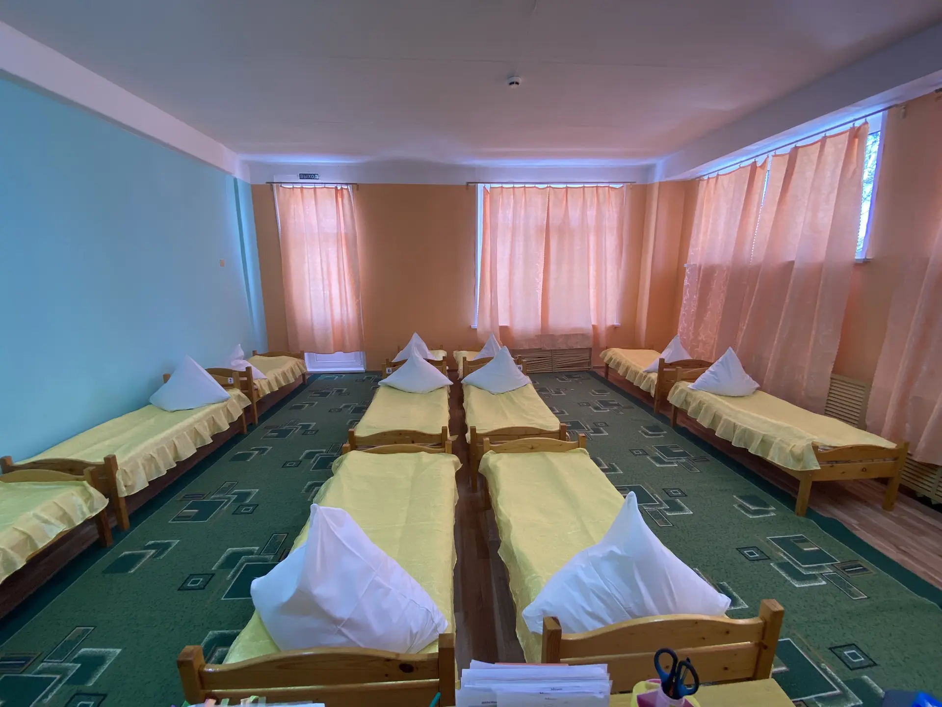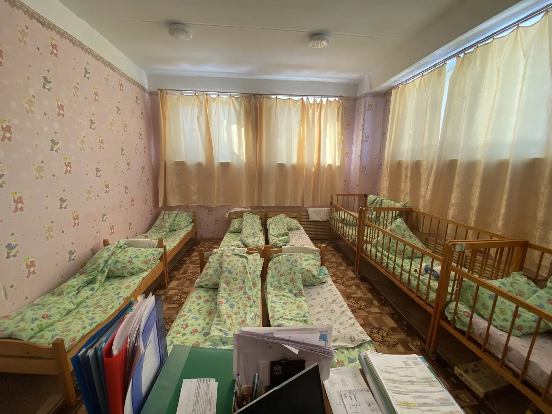 Кроме этого есть спальня для дневного сна. Дети обеспечены индивидуальными постельными принадлежностями, полотенцами, предметами личной гигиены. Постельное белье маркируется индивидуально для каждого ребенка.