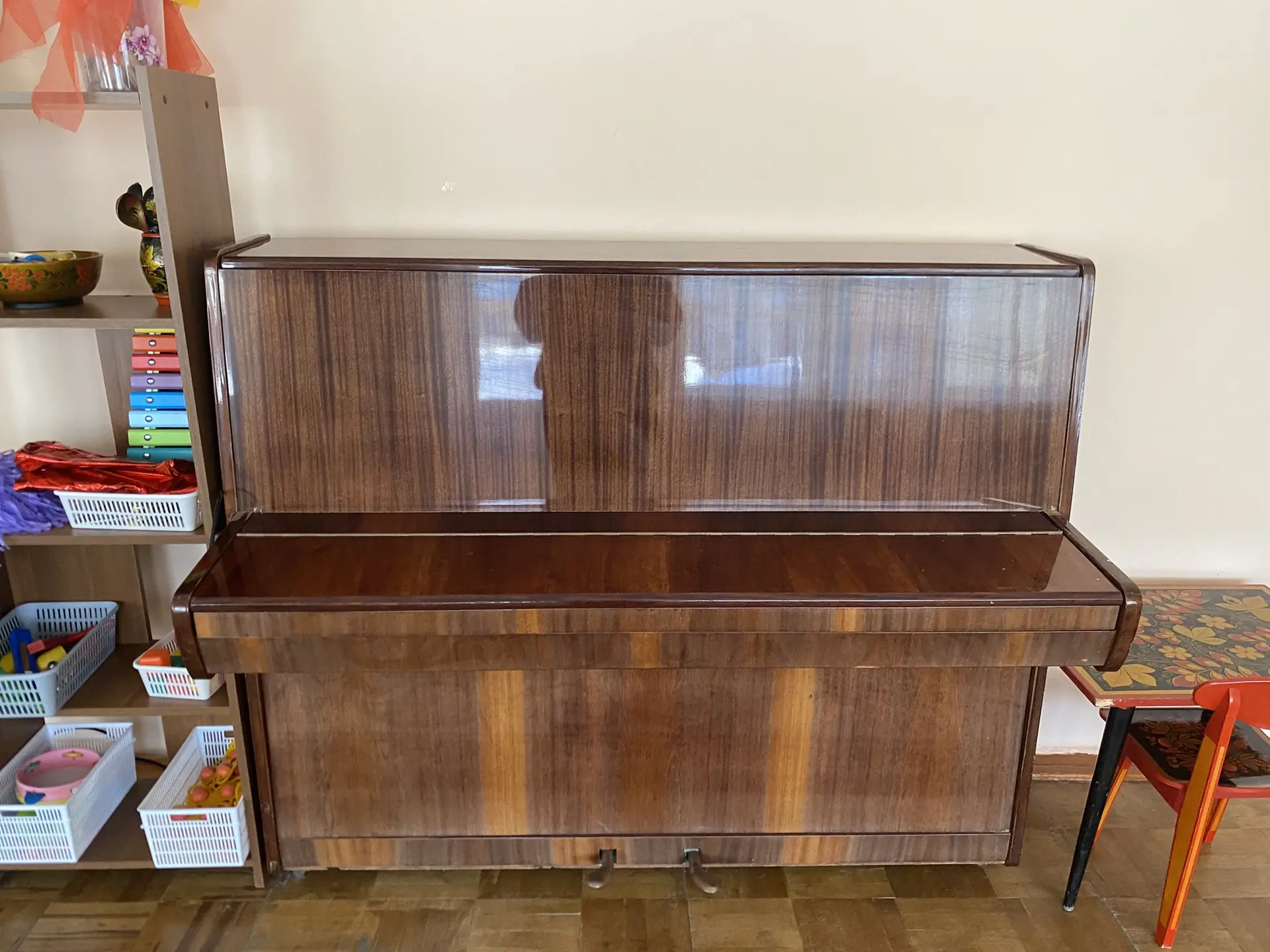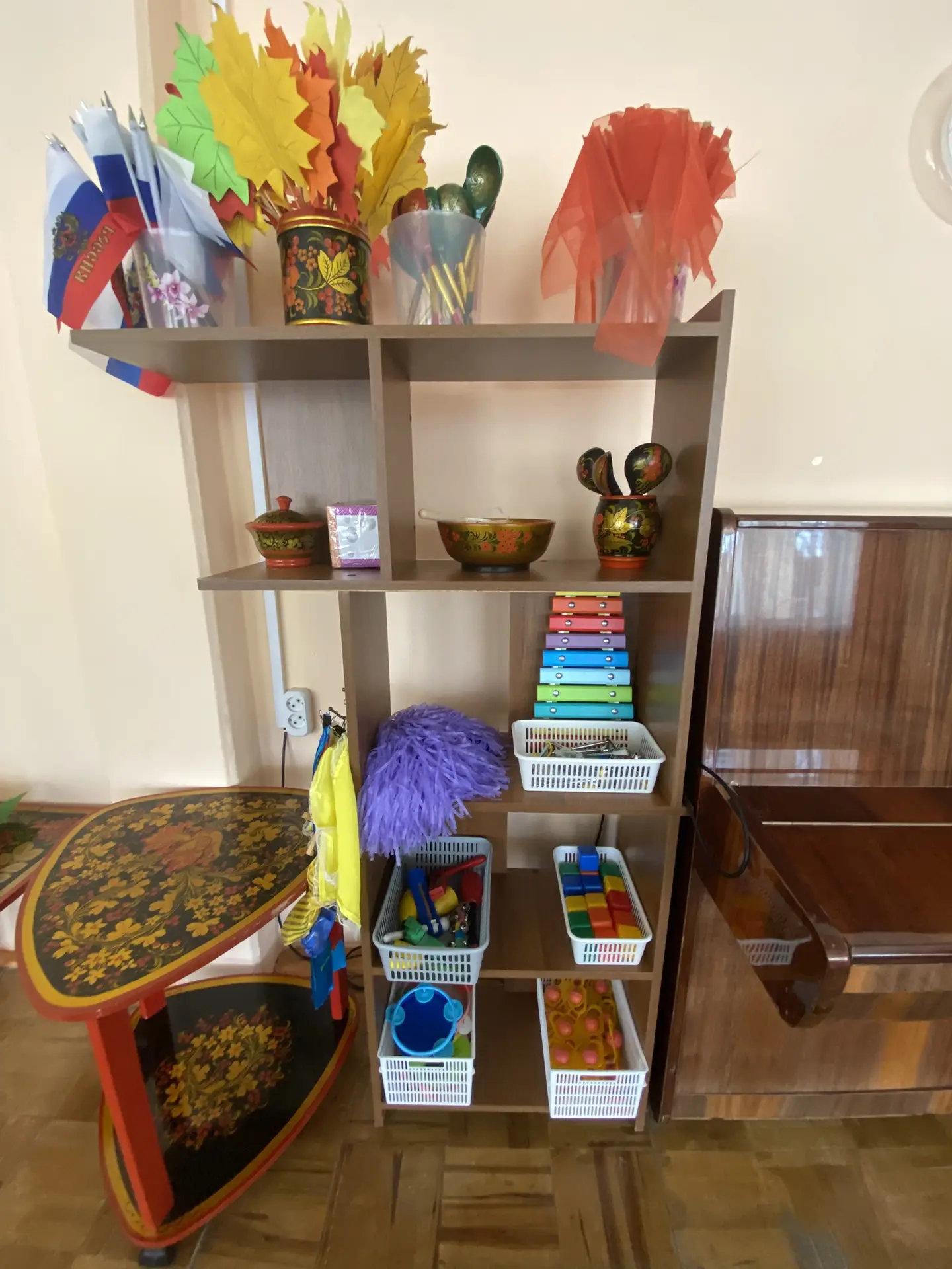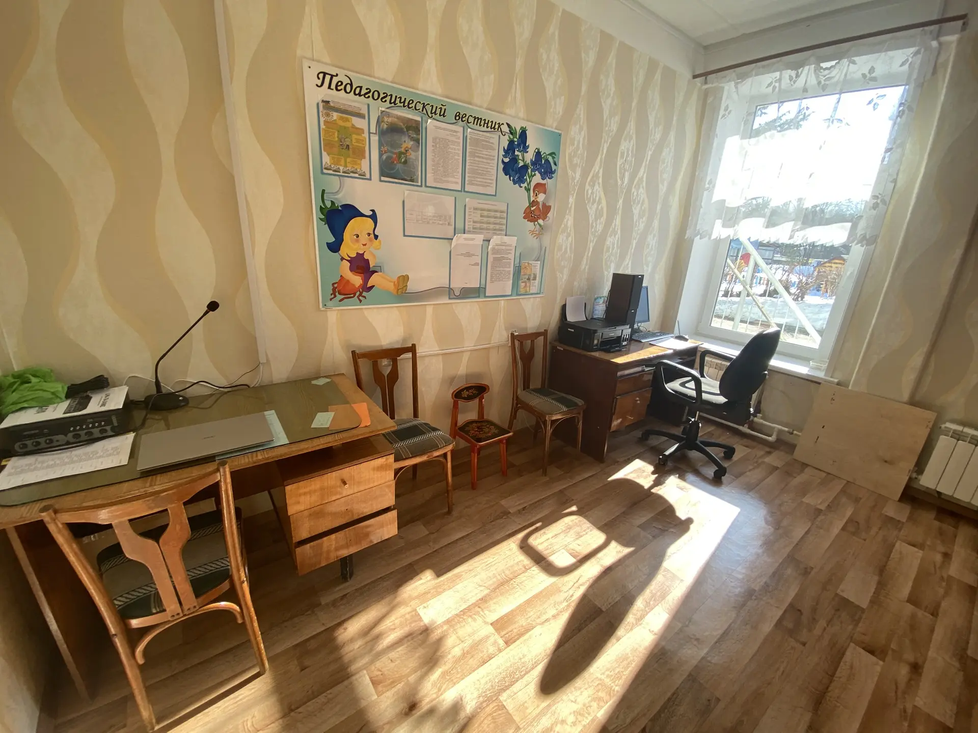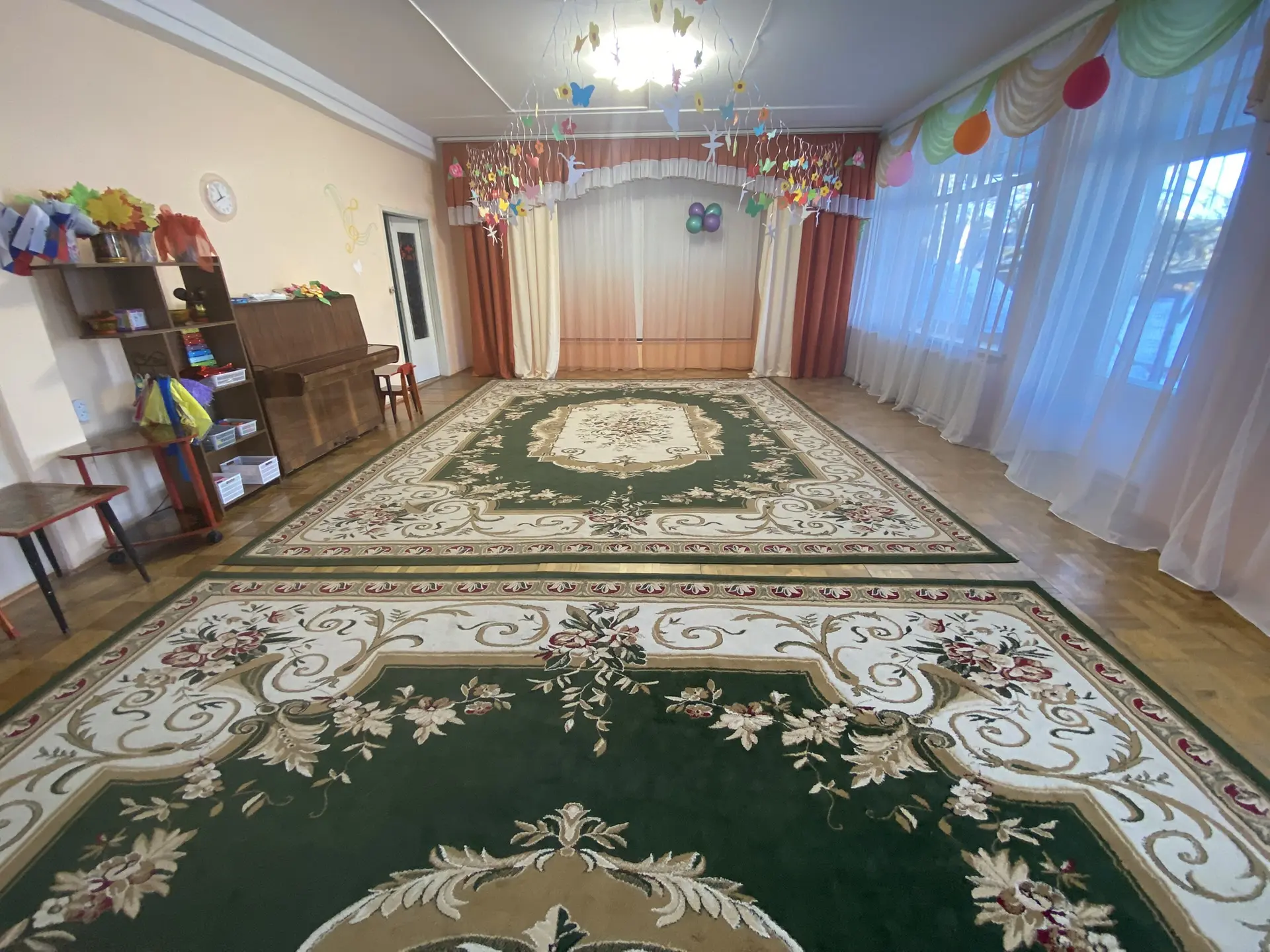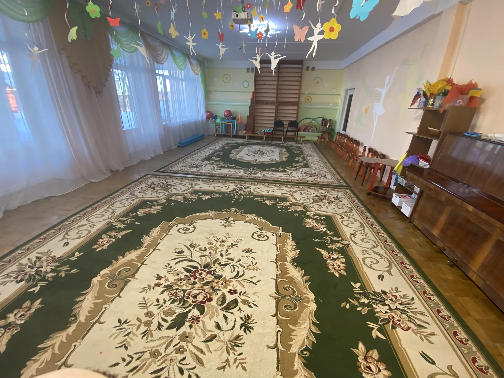 Обеспечен стульями, музыкальным оборудованием для проведения музыкальных занятий. В данном помещении установлено мультимедийное оборудование