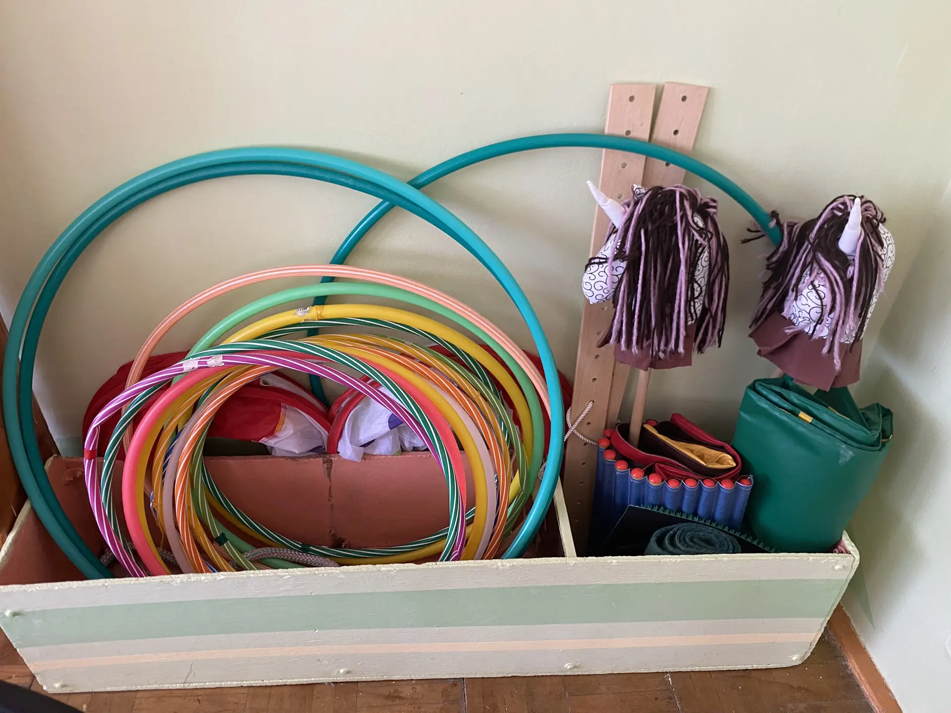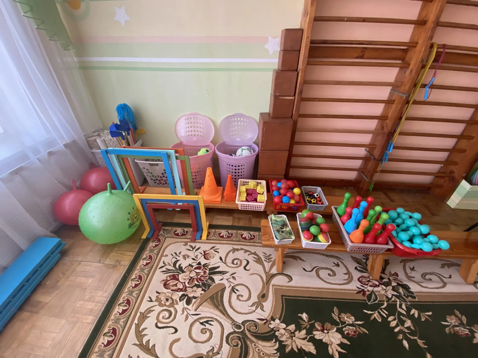 Зал является совмещенным с физкультурным, поэтому там оборудована шведская гимнастическая лестница, а так же имеются различные физкультурные пособия и спортивный инвентарь (обручи, мячи разных диаметров, маты, гимнастические скамейки, шары, мешочки для метания, стойки, шнуры, гимнастические палки, гантели, хопы, султанчики и мн. др).