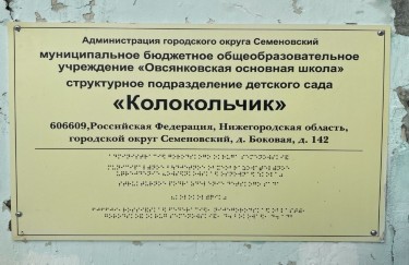 Вывеска с названием организации, графиком работы, выполненные рельефно-точечным шрифтом Брайля на контрастном фоне. МБОУ "Овсянковская основная школа" - структурное подразделение детский сад "Колокольчик"